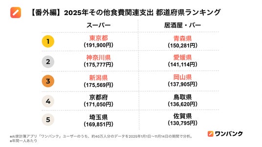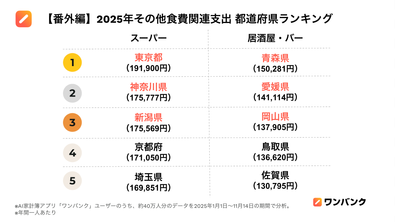 2025年その他の食費関連支出 都道府県ランキング、スーパーでは「東京」、居酒屋・バーでは「青森県」が1位に