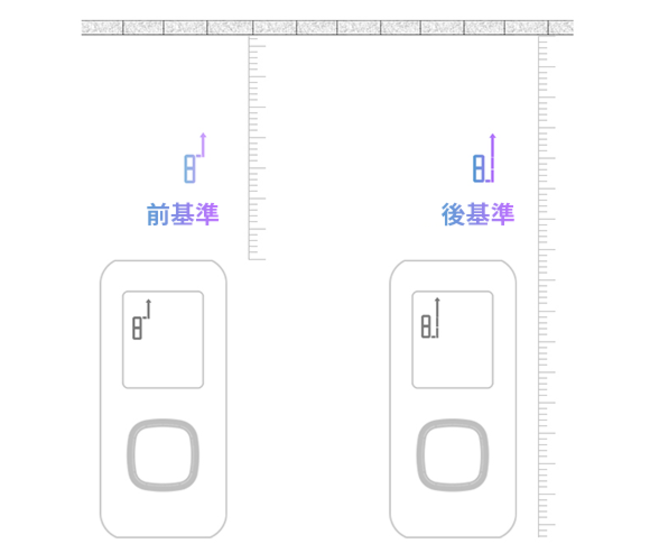 ※レーザーが開いた状態でサイドボタンを長押しすると、前基準と後基準を切り替えることができます。選択しない場合はデフォルトで後基準になります。