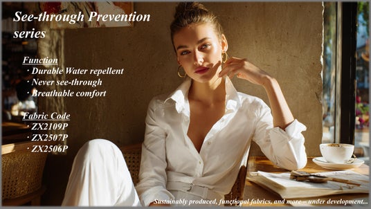 See-through Prevention…防透性があるフルダルのポリエステル原料を使っても、どうしても透けて見えてしまう”白”。そんな悩みを解決する為に、フルダルよりもレベルが高いギガダルを使用した、驚きの撥水機能有りの透け防止素材。日常着のみならず、医療服やゴルフウェア、オケージョンで白いシャツやブラウスが着たい人など、様々なシーンで人の悩みを解決してくれる素材です。