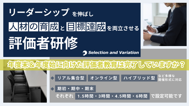 組織・人事コンサルティングファームであるセレクションアンドバリエーション株式会社(以下、当社、東京都千代田区丸の内、東京都港区青山、大阪市西区、名古屋市西区 / 代表取締役社長:平康慶浩/ URL:https://sele-vari.co.jp/)はリーダーシップを伸ばし人材の育成と目標達成を両立させる評価者研修の提供を開始致しましたのでご案内致します。