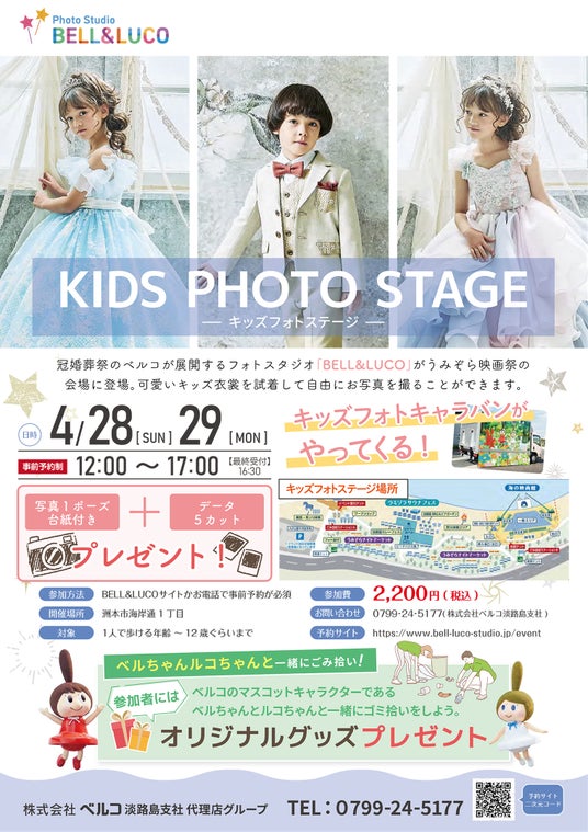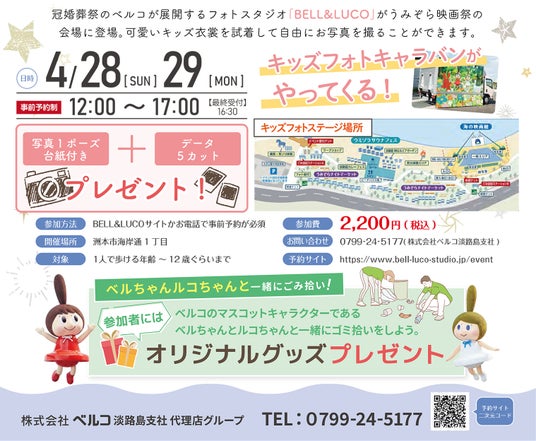 人生の二大行事である「冠婚葬祭」を、互助会という助け合い事業を通じて、お手伝いしてきた株式会社ベルコ(本社:大阪府池田市、代表取締役社長:齋藤 斎、以下「ベルコ」)は、2024年4月28日29日に開催されるうみぞら映画祭にキッズフォトスタジオ「BELL&LUCO」の動く写真スタジオ「キャラバントラック」で登場。ベルちゃんルコちゃんもやってくる!思い出の一コマとしてお子様のキッズフォト撮影予約受付中!