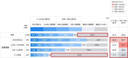 「情報セキュリティ教育の頻度・有無」について、全体では、「実施していない」との回答が約40%で最も多くを占めました。一方で、従業員数が増加するにつれて「月に1回以上~年に1回程度」と回答する割合が増加し、特に従業員数10,001名以上の企業では、その割合が7割以上にのぼります。これに対し、従業員数1~100名の企業では、「実施していない」との回答が70%を超えており、小規模企業における未実施の傾向が顕著に表れています。