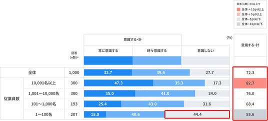 一方で、従業員数が1~100名の企業では、「意識しない」と回答した割合が40%を超えており、企業規模による意識の差が見られました。