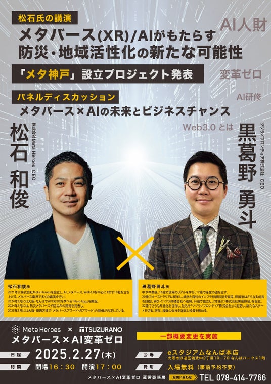 株式会社Meta Heroes(本社所在地:大阪府大阪市、代表取締役:松石和俊、以下「当社」)とツヅラノフロンティア株式会社(本社所在地:兵庫県神戸市、代表取締役:黒葛野勇斗、以下「ツヅラノフロンティア」)は、2025年2月27日(木)に共同でセミナー「メタバース×AI変革ゼロ」を開催いたします。