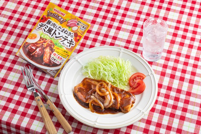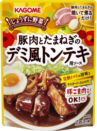 新商品の「豚肉とたまねぎのデミ風トンテキ用ソース」は、普段手に取る機会の多い豚肉や玉ねぎをフライパンで焼いて煮るだけで、ご飯がすすむデミ風の味わいの主菜が1品できる調味料です。完熟トマトの旨味とウスターソースのコクで手軽に野菜が食べられます。