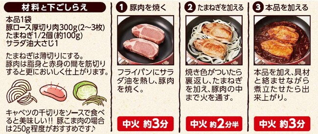 使用材料には豚ロース厚切り肉をおすすめしておりますが、豚こま肉でもおいしくお召し上がりいただけるほか、ご家庭にあるきのこ等を加えたアレンジも可能です。また、付け合わせのキャベツの千切りをソースと絡めて食べると美味しいです。