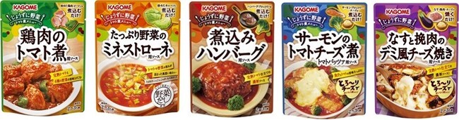 左から、「鶏肉のトマト煮用ソース」「たっぷり野菜のミネストローネ用ソース」「煮込みハンバーグ用ソース」「サーモンのトマトチーズ煮用トマトパッツァソース」「なすと挽肉のデミ風チーズ焼き用ソース」。