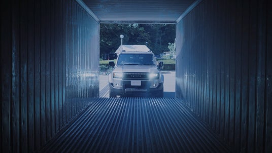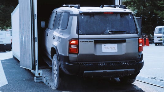 ランドクルーザー“250”とコンテナの全幅の差はたったの5cm。両サイド2.5cmしか余裕がないスペースにランクルを乗り入れるのにもドライバーのテクニックが光ります。