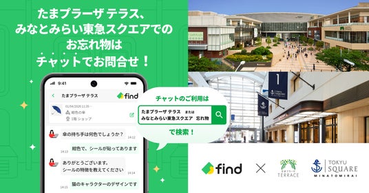 株式会社東急モールズデベロップメント(本社:東京都渋谷区、代表取締役社長:小山 晃司、以下「東急モールズデベロップメント」)が運営する商業施設「たまプラーザ テラス」「みなとみらい東急スクエア」は、2026年4月1日より株式会社find(本社:東京都港区、代表取締役CEO:高島 彬、以下「find」)が提供する「落とし物クラウドfind」を導入しました。