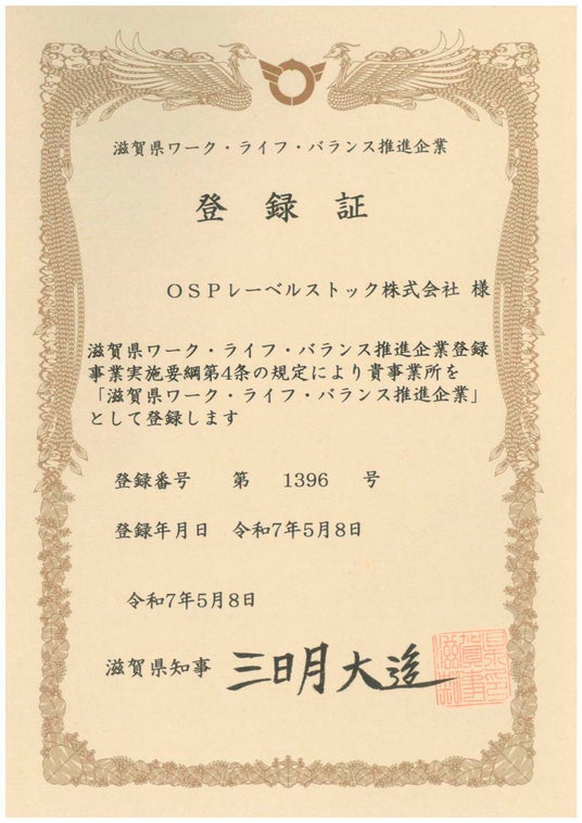 「滋賀県ワーク・ライフ・バランス推進企業登録制度」は、滋賀県が働く人の職場環境を良くすることを目的に設けた制度です。ワーク・ライフ・バランスを実現させるために、子育てしやすい職場や男女ともに働きやすい職場など、積極的に職場環境づくりに取り組む企業を滋賀県が紹介します。OSPレーベルストック株式会社を 含めOSPグループは、今後も従業員が私生活を充実させながらも、仕事で活躍できるように、より良い職場環境づくりに努めてまいります。