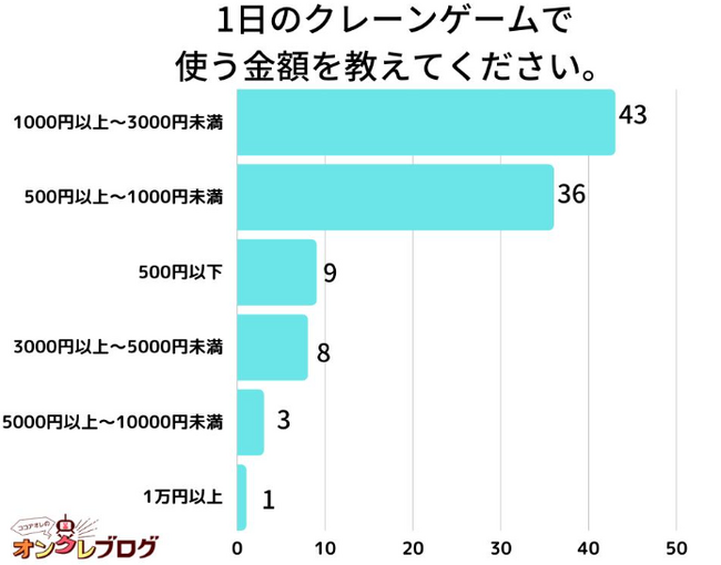 「1日のクレーンゲームで 使う金額を教えてください。」アンケート調査した結果、1位は『1000円以上~3000円未満』でした。