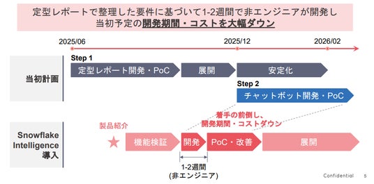 まずは「見るべきデータ」と「生成AIによるコメント」からなる定型レポートを作成。その過程で、Snowflake Intelligenceの紹介を受け、チャットボット構想との親和性があり、実現の可能性が高いと判断し、社内検証を開始しました。Snowflake Intelligenceは「どのように分析してほしいか」を自然言語で指示し保存できるため、エンジニアではないAI推進室のメンバーでも開発可能です。数週間で最初の利用可能版を作成してユーザーへ展開することで構想の前倒しと期間短縮を実現しました。
