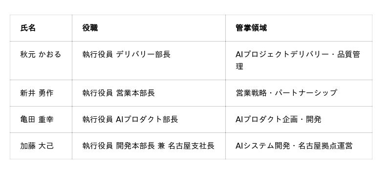 創業以来、多くの大手企業のAI活用推進を支援する中で、お客様のニーズは高度化・多様化しており、事業規模も急速に拡大しております。こうした成長をさらに加速し、より強固な経営基盤を構築するため、このたび各事業領域を統括する執行役員4名を新たに選任いたしました。営業・デリバリー・AIプロダクト・開発の各部門に専任の責任者を配置することで、意思決定の迅速化とサービス品質の一層の向上を図ります。