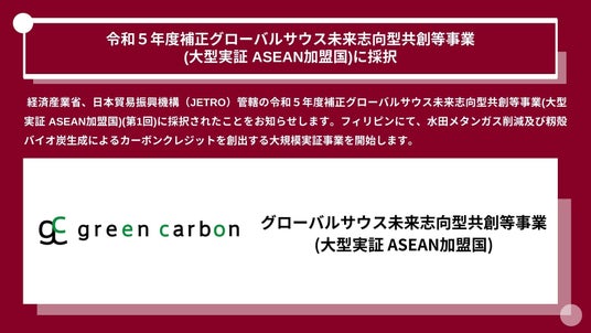 Green Carbon株式会社(代表取締役:大北潤、以下Green Carbon(読み;グリーンカーボン))はこの度、経済産業省、日本貿易振興機構(以下、JETRO)管轄の、令和5年度補正グローバルサウス未来志向型共創等事業(大型実証 ASEAN加盟国)(第1回)に採択されたことをお知らせします。フィリピンにて、水田メタンガス削減及び籾殻バイオ炭生成によるカーボンクレジットを創出する大規模実証事業を開始します。