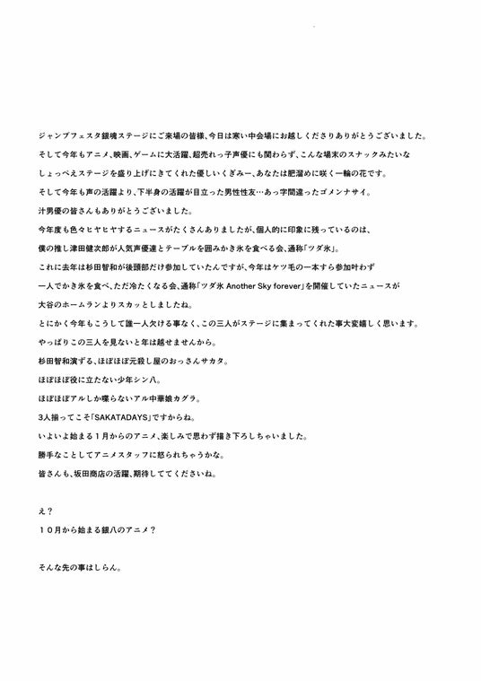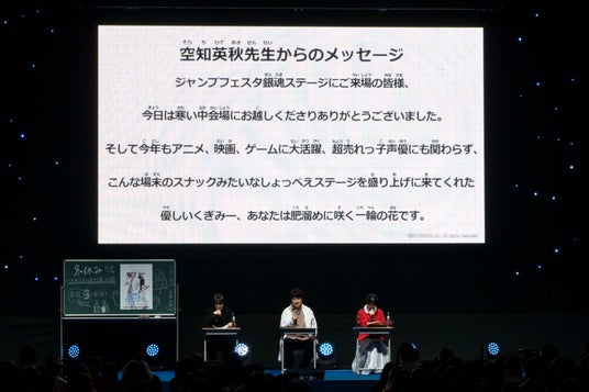 さらに、ファン投票が実施された「キャラクター人気投票」「感動した“〇〇篇”」「爆笑した“第〇訓”」の結果を発表。キャラクター人気投票は上位20位までが原作者の空知先生の描き下ろしとともに紹介され、「新八は今回も8位だった」など大いに盛り上がりました。