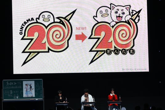 続いて話題は銀魂20周年についての内容に。20周年が2年目に突入(?)し、周年ロゴに定春が追加されたことが紹介されました。ステージでは「3年目はこのロゴがさらにどう変わるのか?」というお題で登壇者がフリップにイラストを描き、それぞれ見せ合いました。