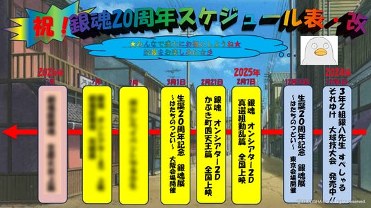 さらに、今後の20周年の展開を紹介とのことで、スクリーンに「銀魂20周年スケジュール表・改」というクソダサい展開プランが記載されたスケジュール表が公開され、2025年2月7日(金)から「銀魂オンシアター2D 真選組動乱篇」が、2月21日(金)から「銀魂オンシアター2D かぶき町四天王篇」が全国の映画館で3週間の限定上映されることなどが紹介されました。