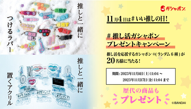 株式会社バンダイ ベンダー事業部(本社:東京都台東区)は、「#推し活ガシャポンプレゼントキャンペーン」を2023年11月4日(土)11:04~2023年11月17日(金)11:04に、X(旧Twitter)にて実施いたします。