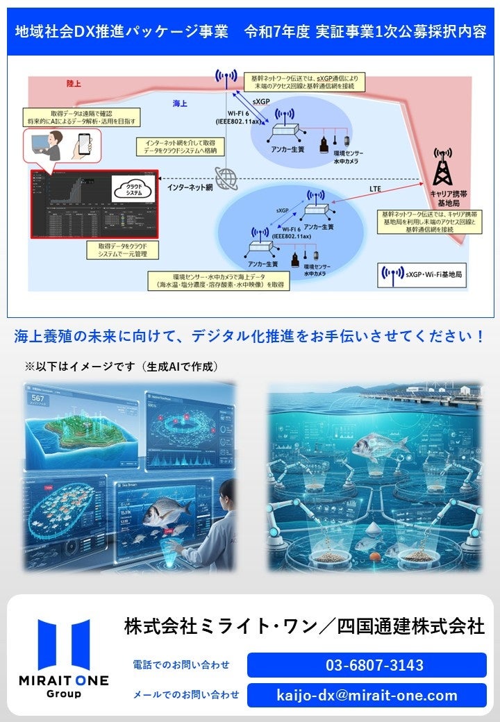 株式会社ミライト・ワン(本社:東京都江東区、代表取締役社長:菅原英宗、以下ミライト・ワン)は、2025年11月12日(水)愛媛県宇和島市役所 本庁2F 大会議室にて、「海上養殖のDX(デジタルトランスフォーメーション)化に向けた取り組み」についてに関するセミナー(以下、本セミナー)を開催します。