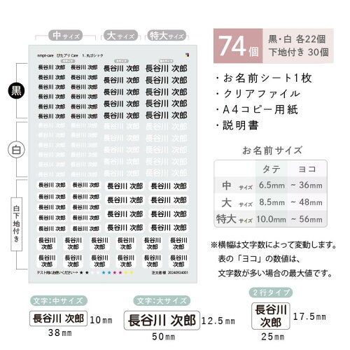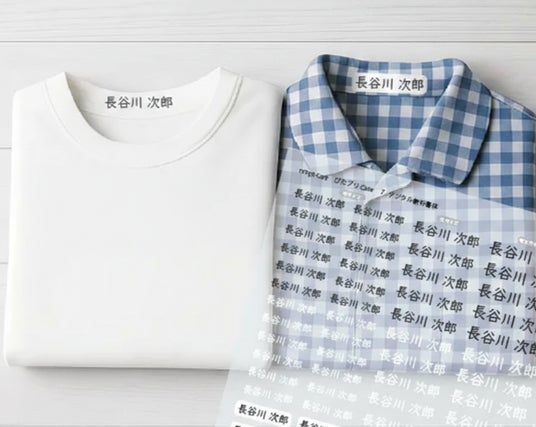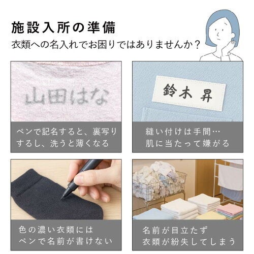 衣類になじみやすい枠なしタイプと、柄物でも識別しやすい白地付きタイプを組み合わせ、貼る場所や衣類に応じて使い分けができる設計としています。