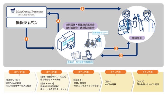 このような社会課題解決の一助となるべく、M&A仲介業界最大手のMACPが提供する医業承継コンサルティングを中心とした各種サービスを、損保ジャパンが病院団体、都道府県医師会・歯科医師会・医師協同組合等に紹介する形で全国展開します。