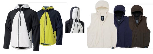 ・注目のファン付きウェアは世界初の暑熱軽減素材XShelterを使用したファンウェアが登場。ファスナーをフード上まであげれば、一見シュールながらも頭まで風が衣服内を駆け巡ります。もう1点は女性でも着れるファン付きベスト。シンプルかつどんな衣装にも合わせやすいカラーが魅力。