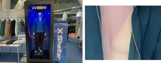・UVカット機能体験コーナーではUV照射ルームを設置。UVに反応する特殊なマネキンにXShelter暑熱軽減ウェアを着せ、UVカット機能を“見える化”します。また人が実際に入ってUVカット機能を体験できる「特大UV照射ROOM」も用意、カメラマンとともに入室が可能です。