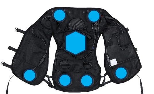 ・風による気化熱で冷却するのでなく、半導体を使った冷却プレートがダイレクトの体を冷やす冷房服は昨年よりさらに進化。昨年は5カ所だった冷却プレートをなんと7カ所に増設しさらに効率的なクールダウンが可能に。
