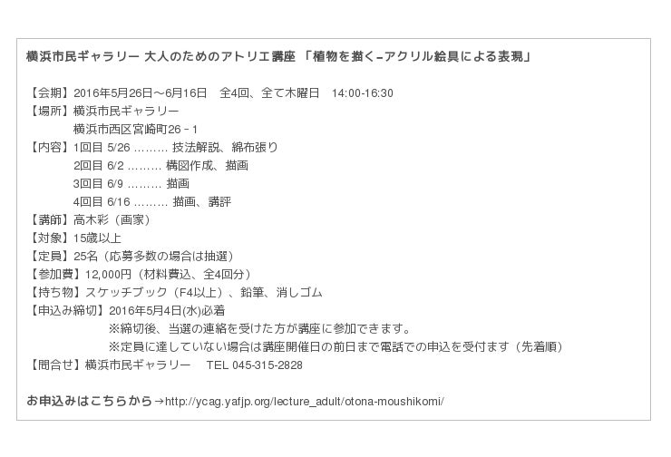 横浜市民ギャラリー 大人のためのアトリエ講座 「植物を描く−アクリル絵具による表現」開催。参加者募集中!