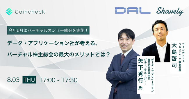 コインチェック株式会社(本社:東京都渋谷区、代表取締役社長:蓮尾聡、以下、コインチェック)と株式会社データ・アプリケーション(本社:東京都中央区、代表取締役社長:安原 武志、略称:DAL、スタンダード市場:3848)は、2023年8月3日(木)に無料セミナー「データ・アプリケーション社が考える、バーチャル株主総会の最大のメリットとは?~今年6月にバーチャルオンリー総会を実施!~」を共同開催します。