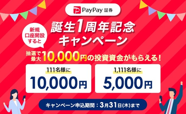 PayPay証券誕生1周年を記念して、2022年2月1日(火)から3月31日(木)までの期間中に新規口座を申し込みの上、4月30日(土)までに口座開設されたお客さまの中から抽選で111人に10,000円、1,111人に5,000円の投資資金をプレゼントするキャンペーンを実施します。