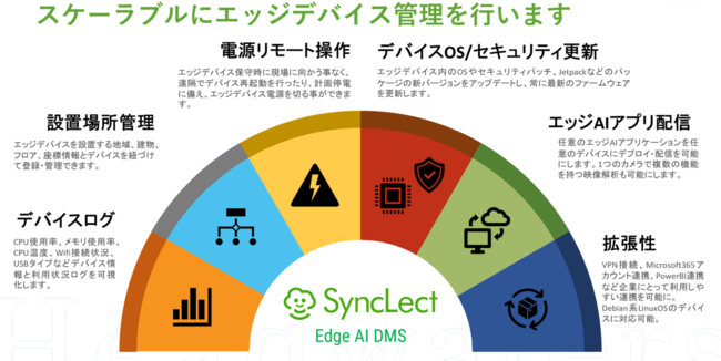 「SyncLect Edge AI DMS」は、広域に大量設置したデバイスを遠隔モニタリングで一元管理することによって、スマートストアやスマートビルディング、スマートファクトリーを展開する企業のデバイス管理業務に対する負荷軽減と効率化を実現する、高性能かつセキュアなソリューションとなります。