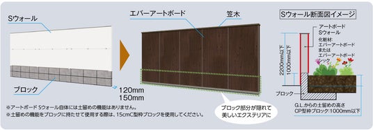 ブロックを積んだ上に、同じ厚さのSウォールを設ける仕様により、フェンスとは違いブロックと同面で一体感のある仕上げが可能です。また、化粧材として弊社の主力製品である「エバーアートボード(R)」、「エバーアートボード(R)シック」を使用。全153色から選ぶことができるので、住宅のテイストはもちろん、街並みになじみながらもオリジナル感を演出できるので、分譲地での採用にもおすすめです。