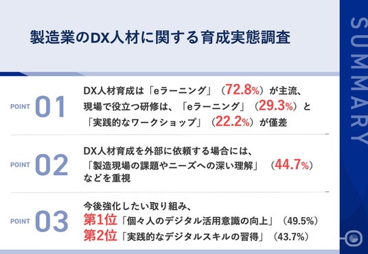 今回の調査では、DX推進で成果を上げている大手製造業においても、人材育成において「個々人の活用意識不足」(43.7%)や「全社的なリテラシー不足」(40.8%)といった課題が顕在化していることが明らかになりました。