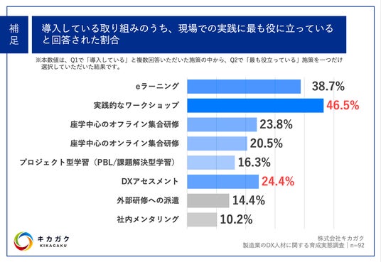 - 実施している取り組みのうち、現場での実践に最も役立つと回答された上位3つは「実践的なワークショップ」46.5%、「eラーニング」38.7%、「DXアセスメント」24.4%