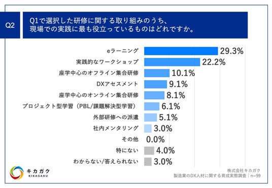 Q1で「特にない」「わからない/答えられない」以外を回答した方に、「Q2.Q1で選択した研修に関する取り組みのうち、現場での実践に最も役立っているものはどれですか。」(n=99)と質問したところ、「eラーニング」が29.3%、「実践的なワークショップ」が22.2%、「座学中心のオフライン集合研修」が10.1%という回答となりました。