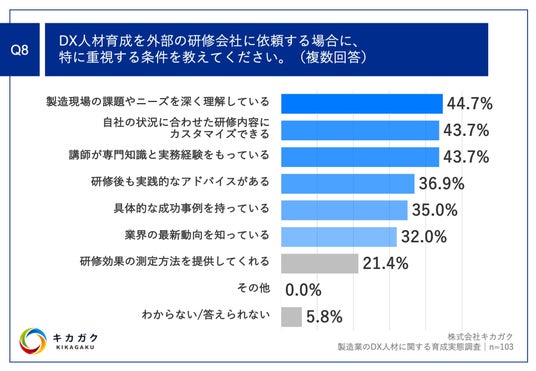 「Q8.DX人材育成を外部の研修会社に依頼する場合に、特に重視する条件を教えてください。(複数回答)」(n=103)と質問したところ、「製造現場の課題やニーズを深く理解している」が44.7%、「自社の状況に合わせた研修内容にカスタマイズできる」が43.7%、「講師が専門知識と実務経験をもっている」が43.7%という回答となりました。