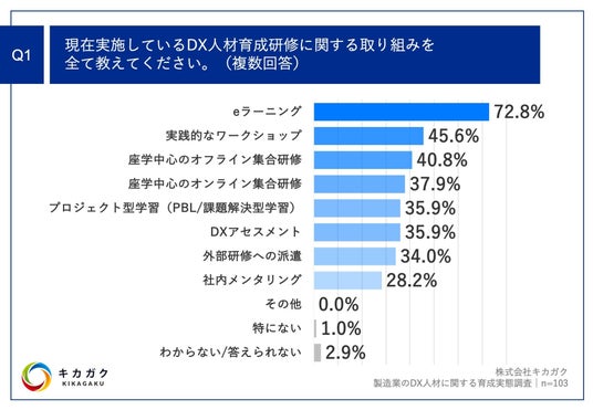 「Q1.現在実施しているDX人材育成研修に関する取り組みを全て教えてください。(複数回答)」(n=103)と質問したところ、「eラーニング」が72.8%、「実践的なワークショップ」が45.6%、「座学中心のオフライン集合研修」が40.8%という回答となりました。