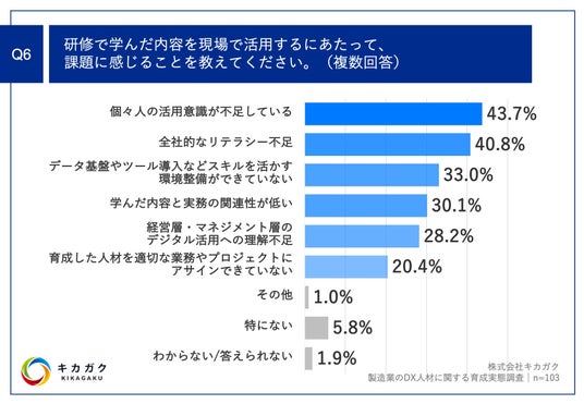 「Q6.研修で学んだ内容を現場で活用するにあたって、課題に感じることを教えてください。(複数回答)」(n=103)と質問したところ、「個々人の活用意識が不足している」が43.7%、「全社的なリテラシー不足」が40.8%、「データ基盤やツール導入などスキルを活かす環境整備ができていない」が33.0%という回答となりました。