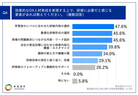 「Q4.効果的なDX人材育成を実現する上で、研修に必要だと感じる要素があれば教えてください。(複数回答)」(n=103)と質問したところ、「学習者のレベルに合わせた研修内容の選択」が47.6%、「最適な研修形式の選択(eラーニング/集合研修/ワークショップetc.)」が45.6%、「現場の問題解決につながる内容・ワーク設計」が45.6%という回答となりました。
