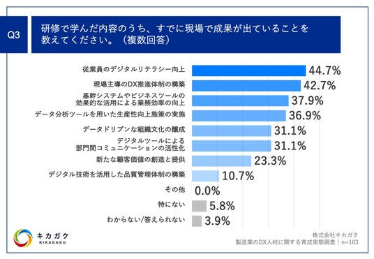 「Q3.研修で学んだ内容のうち、すでに現場で成果が出ていることを教えてください。(複数回答)」(n=103)と質問したところ、「従業員のデジタルリテラシー向上」が44.7%、「現場主導のDX推進体制の構築」が42.7%、「基幹システムやビジネスツールの効果的な活用による業務効率の向上」が37.9%という回答となりました。
