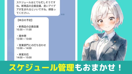 AI秘書さんは、ChatGPT連携キャラクターが専属秘書となり、相談相手になったりスケジュール管理をしてくれたりするサービスです。LINE公式アカウントに友だち登録するだけで、個性あるキャラクターと感情豊かにコミュニケーションすることができるほか、スケジュールを毎日共有、また相談や悩み事をチャットで聞いてくれます。「業務に追われて今日の予定を確認できない」「仕事で困ったことがあって誰かに相談したい」そんな時はAI秘書さんをぜひご活用ください。