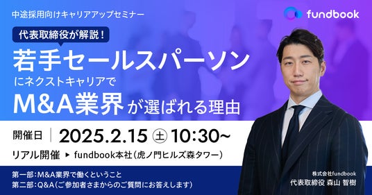 M&A仲介を行う株式会社fundbook(本社:東京都港区、代表取締役:森山智樹・渡邊和久、読み:ファンドブック、以下「当社」)は、2025年2月15日(土)に対面形式の「fundbook 若手セールスパーソン向けキャリアアップセミナー」を実施します。