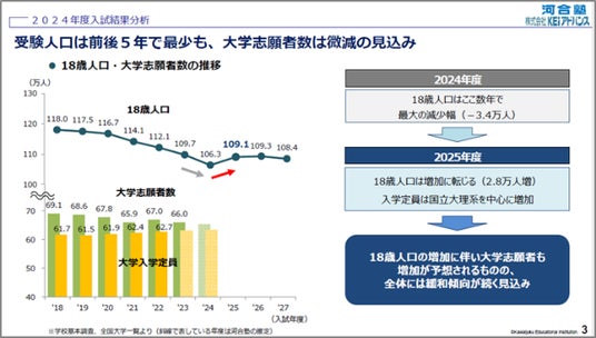 2025(令和7)年度入試は新課程入試初年度であり、大学入学共通テストでは教科「情報」が加わります。入試制度が大きく変わる年は受験生が安全志向となり、レベルの高い大学に積極的にチャレンジしない、という傾向がある一方、昨今の少子化に伴い競争が緩和されており、志望する大学を積極的に受験する姿勢が見られる可能性もあります。