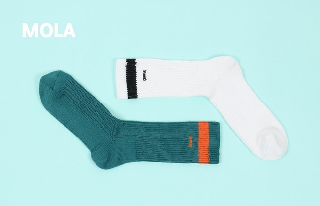 MOLA(モラ)はざっくりとした生地感が特徴の厚手リブソックスのライン。ローゲージ編みでオーガニックコットンのナチュラルな風合いが表現されたバルキーなリブ編みに、バイカラーのラインでスポーティーなアクセントを添え、スニーカーやスポーツサンダルとの相性が良いシリーズが完成。
