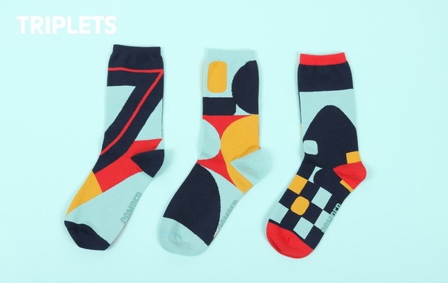 TRIPLETS(トリプレッツ)はスペイン語で「三つ子」という意味で、異なるグラフィカルなデザインが3つで1セットのラインです。カンペールのTWINSコンセプトからインスパイアされた異なる非対称なデザインをその日の気分で組み合わせを楽しめるソックス。シーズンテーマ&カラーをイメージしたグラフィックを、ミドルゲージで編み上げてカラフルに仕上げました。