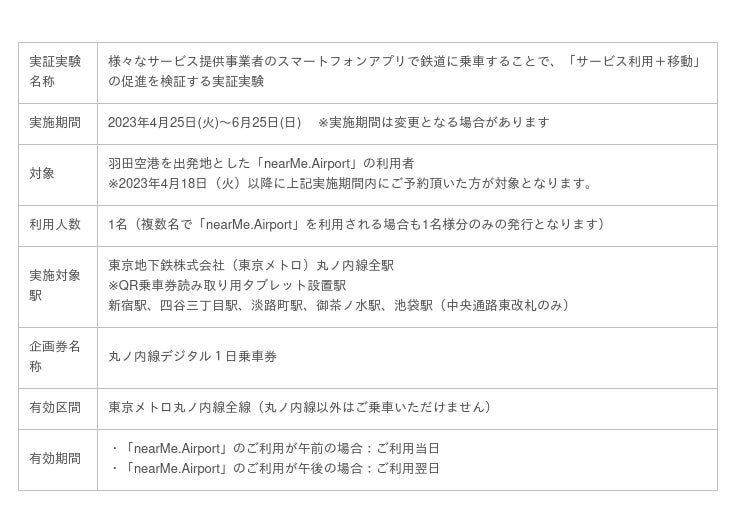 本実証実験は、公共交通機関の利用を活性化させることを目的にしたもので、実証実験期間中に羽田空港を出発地として「nearMe.Airport(ニアミー エアポート)」をご利用いただくお客様を対象に、東京メトロ丸ノ内線の1日乗車券(QR乗車券)をニアミーのスマートフォンアプリおよびサービスサイトを通じて取得していただくことができます※2。これにより、羽田空港から宿泊地や観光地までのドアツードアでの移動が可能になるだけでなく、東京メトロ丸ノ内線沿線内を1日乗り放題※3となることで、ビジネスシーン、プライベートシーンを問わず移動をお楽しみいただけます。