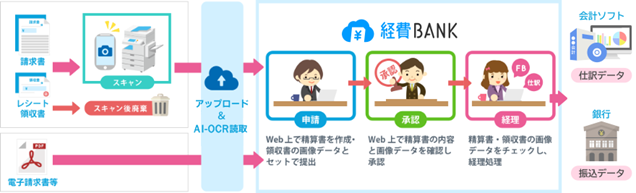 本キャンペーンでは、深層学習により経理特有の証憑パターンを予め学習させたAIによる高精度な文字認識で、迅速かつ正確に証憑をデータ化できる「領収書AI-OCR」及び「請求書AI-OCR」を、それぞれ月100枚まで最大7ヶ月間無料でご利用いただくことができます。紙で受領しスマートフォンなどで撮影、または複合機などでスキャンした領収書・請求書の画像データをAI-OCRで読み取り「経費BANK」に取り込むことで、経費精算申請や支払依頼データ作成にかかる手入力の手間を大幅に削減することが可能です。また、「経費BANK」は改正電子帳簿保存法の要件を満たした電子保存にも対応しているため、スキャン後の証憑は原本保管も不要になります。