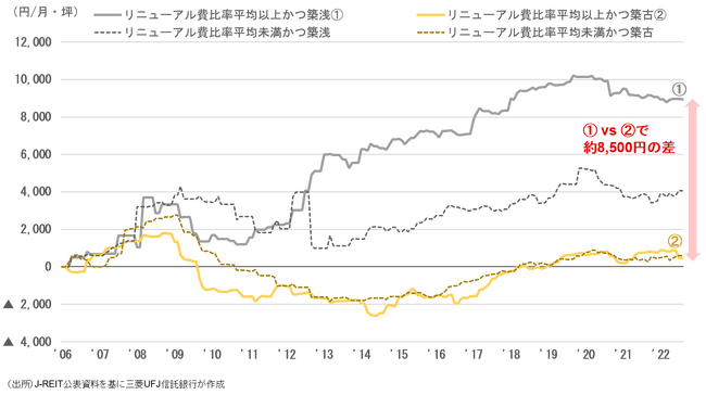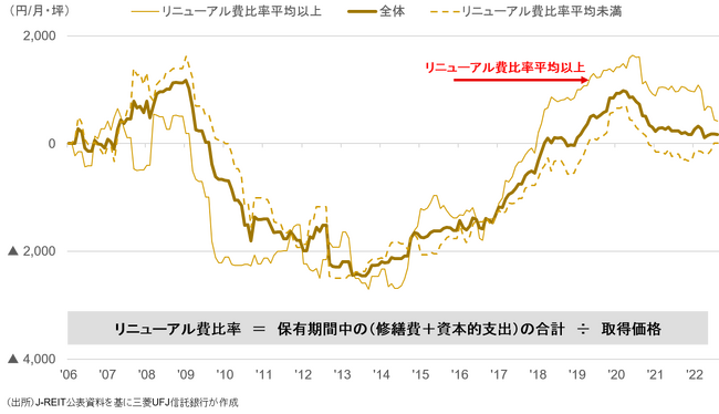リニューアル費比率を平均以上にかけても、築古物件の収益性の上昇は限定的