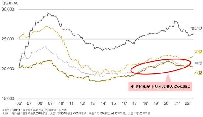 ビル規模別では、小型ビルの収益性(月・坪あたりの賃貸事業収入)が上昇